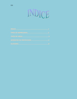 Este documento proporciona información sobre diferentes tipos de impresoras, virus y aparatos de protección. Describe brevemente impresoras, virus de macros, troyanos y gusanos. Luego explica que reguladores y supresores de picos protegen contra variaciones de voltaje, mientras que fuentes de alimentación ininterrumpidas también respaldan el equipo durante cortes de energía. Recomienda proteger el equipo pero evitar su uso durante tormentas eléctricas.