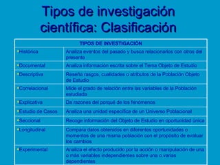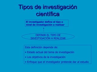 Este documento describe los diferentes tipos de investigación científica y el proceso general de investigación. Explica que el investigador debe definir el tipo de investigación a realizar en función del estado actual del tema, los objetivos de la investigación y el enfoque que se pretende dar. Además, clasifica los diferentes tipos de investigación como histórica, documental, descriptiva, correlacional, explicativa y otros, e identifica métodos cualitativos y cuantitativos. Finalmente, resume las etapas clave del proceso de investigación como la formación de conceptos, generalizaciones,