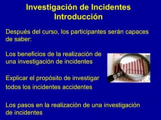 Este documento describe el proceso de investigación de incidentes en el lugar de trabajo. Explica que investigar incidentes ayuda a prevenir lesiones futuras al identificar las causas raíces y aplicar medidas correctivas. También detalla los pasos clave de una investigación, como revisar la escena, recopilar pruebas a través de fotos e entrevistas, analizar la información, recomendar cambios y realizar un seguimiento. El objetivo final es comprender completamente cómo y por qué ocurrió un incidente para mejorar la seguridad.