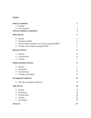Este documento describe varios softwares estadísticos cuantitativos y cualitativos. Incluye información sobre el historial, características y ventajas de SPSS, OpenStat, Minitab, AQUAD Seis, ATLAS.ti y MAXQDA. El documento concluye que estos softwares son herramientas útiles para ordenar y analizar datos de investigación.