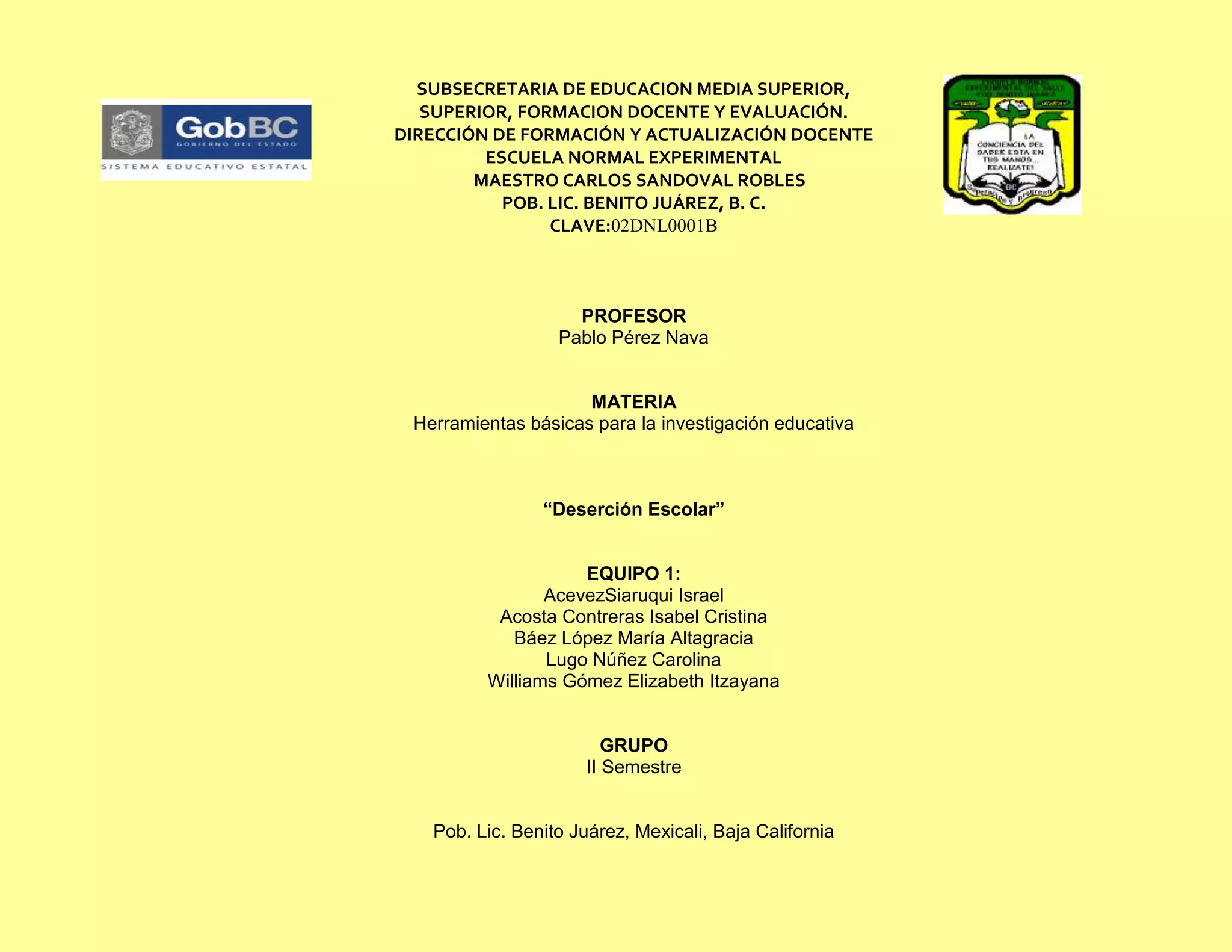 Este documento resume una investigación sobre la deserción escolar en México. La investigación identificó varias causas comunes de deserción, incluyendo migración de familias, disfunción familiar, falta de atención de los padres, bajos ingresos económicos y problemas sociales como falta de escuelas accesibles. La investigación también destacó programas existentes diseñados para abordar este problema, como becas para estudiantes de bajos ingresos y programas de apoyo para estudiantes con dificultades de aprendizaje. El método