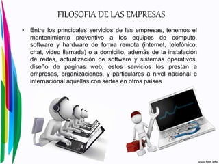 El documento proporciona información sobre los servicios técnicos ofrecidos por varias empresas. Entre los servicios más comunes se encuentran el mantenimiento preventivo de equipos, la instalación y actualización de software y hardware, el diseño de páginas web y la asistencia remota. Cada empresa también ofrece servicios adicionales como ensamblaje de computadoras, limpieza de equipos, cableado de redes e instalación de sistemas de seguridad.