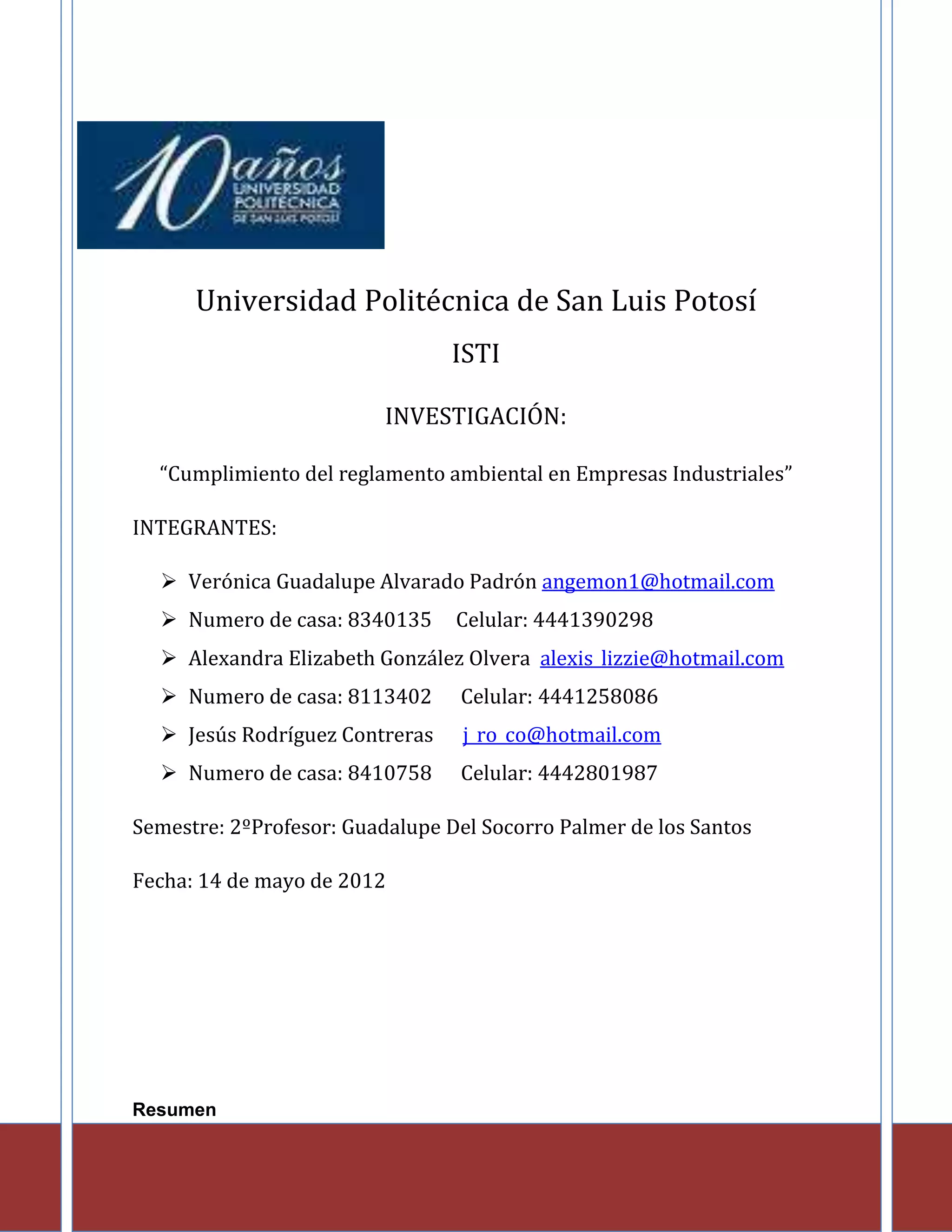 Este documento presenta una investigación sobre el cumplimiento del reglamento ambiental por parte de empresas industriales en San Luis Potosí, México. La investigación incluyó entrevistas a dos empresas industriales y a la Secretaría de Medio Ambiente y Recursos Naturales para comparar sus reglamentos ambientales. El objetivo era verificar si los reglamentos de las empresas son adecuados para el cuidado del ambiente.