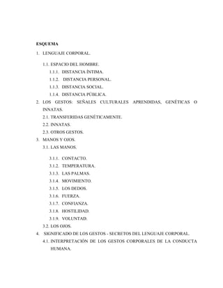Este documento describe un estudio sobre la expresión de sentimientos y emociones a través del lenguaje corporal en estudiantes de preparatoria. Presenta un marco teórico sobre el lenguaje corporal y cómo afecta la convivencia. El objetivo es identificar las expresiones corporales más comunes en los estudiantes y su significado. Se realizarán encuestas y entrevistas para analizar gestos y su influencia en las relaciones interpersonales. Los resultados pueden ayudar a comprender mejor el comportamiento humano.