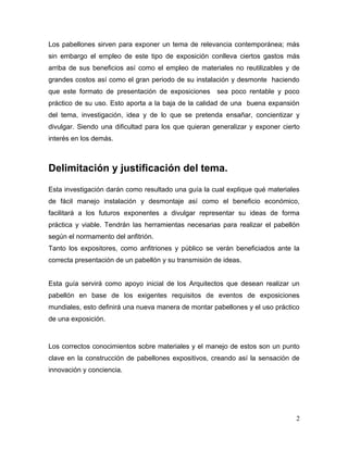 Los pabellones de exposición sirven para mostrar temas de relevancia contemporánea al público. Sin embargo, su construcción conlleva altos costos y materiales no reutilizables. Esta investigación busca crear una guía para futuros expositores sobre cómo construir pabellones de forma práctica y económica usando materiales de fácil instalación y desmontaje.