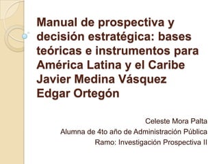 Este documento describe los componentes necesarios para implementar sistemas de prospectiva, incluyendo los perfiles de equipos de proyecto, servicios básicos como vigilancia, investigación y publicación, y ejemplos de servicios de prospectiva en el sector público en Francia y Brasil. También resume lecciones aprendidas de experiencias de prospectiva en Europa y América Latina, enfatizando la importancia de generar visiones compartidas sobre oportunidades tecnológicas y desafíos futuros, y fortalecer las capacidades de los equipos de prospectiva en Am