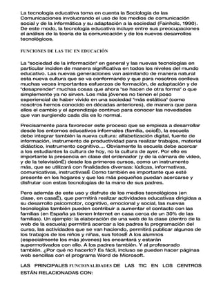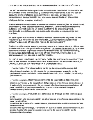 Este documento describe las tecnologías de la información y la comunicación (TIC), incluyendo sus orígenes en la informática y las telecomunicaciones. Explica que las TIC permiten acceder, producir, procesar y comunicar información en diferentes formatos como texto, imágenes y sonido. También describe algunas aplicaciones comunes de las TIC como el correo electrónico, las listas de distribución y los grupos de noticias.