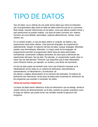 El documento habla sobre los tipos de datos en programación. Explica que los tipos de datos imponen restricciones sobre los valores que pueden almacenar las variables y las operaciones que se pueden realizar con ellas. Luego describe algunos tipos de datos primitivos como enteros, reales, caracteres y booleanos, indicando su tamaño de memoria. Finalmente, muestra ejemplos de tipos de datos en el lenguaje Pascal.
