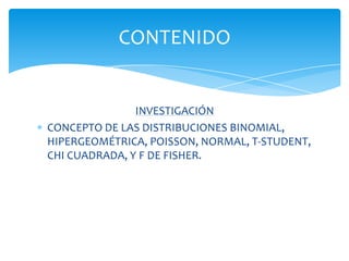 Este documento describe varias distribuciones de probabilidad importantes, incluyendo la distribución binomial, hipergeométrica, Poisson, normal, t-student y chi cuadrada. Explica las propiedades y aplicaciones de cada distribución, así como ejemplos ilustrativos. Las distribuciones son herramientas estadísticas útiles para modelar una variedad de fenómenos aleatorios.