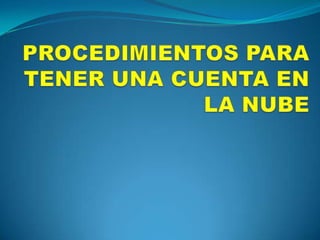 Este documento describe cómo crear una cuenta de Gmail y usar las aplicaciones de Google Docs, Sheets y Slides en la nube sin necesidad de instalar el software. Explica que la nube ofrece una opción segura para almacenar archivos y documentos en caso de que se pierda un USB o dispositivo de almacenamiento.