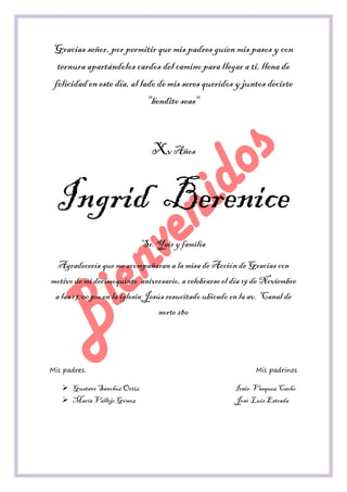 Ingrid Berenice invita a varias personas, incluyendo al Sr. Carlos y familia, Sr. Yair y familia, Sr. Santiago y familia, y otros, a una misa de Acción de Gracias el 19 de Noviembre a las 17:00 pm en la iglesia Jesús Resucitado para celebrar su 15o aniversario. Agradece a sus padres y a Dios por guiar sus pasos.