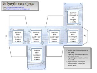 El documento proporciona instrucciones para ensamblar una caja mediante el recorte de un troquel y el plegado de varias piezas. Se detallan los pasos para pegar la lengüeta y finalizar la estructura. También incluye enlaces a un sitio web y un blog relacionados.