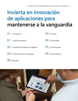Este documento habla sobre la importancia de invertir en innovación de aplicaciones para mantenerse a la vanguardia. Explora temas como los casos de negocios a favor de la innovación, las clases de innovación, cómo aumentar la innovación y agilidad, el papel de las personas, procesos y tecnología, y pasos para prepararse para la innovación. El documento enfatiza la necesidad de definir claramente el porqué de la innovación y establecer métricas para medir el valor que aporta a la organización.