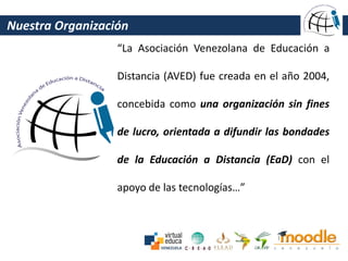 La Asociación Venezolana de Educación a Distancia (AVED) es una organización sin fines de lucro fundada en 2004 para promover la educación a distancia. Su misión es congregar a docentes, profesionales e interesados en la educación a distancia para producir intercambios y profundizar el estudio de esta modalidad educativa tanto a nivel nacional como internacional. La AVED ofrece varios beneficios a sus miembros, como descuentos en eventos y acceso a recursos educativos.