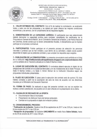 La Institución Educativa Pablo VI de Manizales solicita propuestas para la contratación del suministro de diplomas, actas de grado y medallas para los estudiantes que culminan la educación media. El proceso de selección se basará en la propuesta más económica y de mejor calidad, cumpliendo con los requisitos legales establecidos. Las ofertas se recibirán hasta el 4 de octubre de 2017, y el contrato deberá ejecutarse en un plazo de 15 días hábiles una vez firmado.