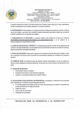 La Institución Educativa Pablo VI de Manizales busca contratar servicios de internet y asesoría contable mediante un proceso de selección pública, cumpliendo con normativas legales y requisitos específicos. Las propuestas serán evaluadas en función de calidad y costo, con un enfoque en la selección de la opción más económica y conforme a los requisitos vigentes. El contrato tendrá una duración de seis meses y se ejecutará en la sede de Barrios Unidos, con cierta documentación necesaria para la participación.