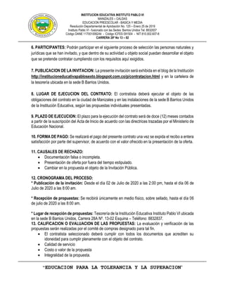 La institución educativa Instituto Pablo VI de Manizales invita a personas naturales o jurídicas a participar en la contratación para adquirir una póliza de manejo sector oficial. El proceso se regirá por la normativa vigente y se evaluarán las propuestas según criterios de economía y calidad. Se publicará la invitación en su blog y en la cartelera de la tesorería, con un plazo de recepción de ofertas del 02 al 06 de julio de 2020.