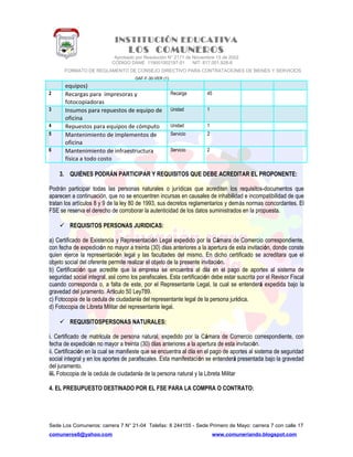 Este documento es una invitación pública realizada por el Fondo de Servicios Educativos de la Institución Educativa Los Comuneros para contratar diferentes bienes y servicios. Detalla el cronograma del proceso, los requisitos para participar, el presupuesto disponible de $7'231.000, y las condiciones generales del contrato como plazo de ejecución de 12 meses, forma y términos de pago, obligaciones de los proponentes, y procedimientos de liquidación.