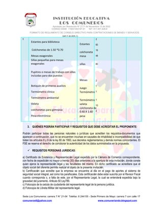 Este documento resume una invitación pública realizada por el Fondo de Servicios Educativos de la Institución Educativa Los Comuneros para contratar bienes y servicios. Se describe el cronograma del proceso de selección, los bienes y servicios a contratar, los requisitos para participar, el presupuesto disponible de $9'294.000, y las condiciones del contrato como plazo de ejecución de 12 meses y forma de pago.