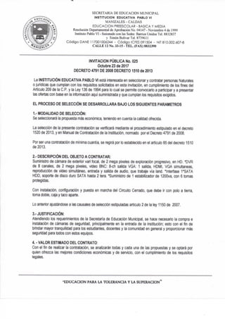 La institución educativa Pablo VI convoca a personas naturales o jurídicas para la contratación de cámaras de seguridad y un estabilizador, buscando garantizar la seguridad dentro de sus instalaciones. Las propuestas serán evaluadas según su calidad y costo, con un proceso de selección bajo las normativas establecidas. La convocatoria se publicará el 23 de octubre de 2017, y se evaluarán las ofertas hasta el 26 de octubre de 2017.