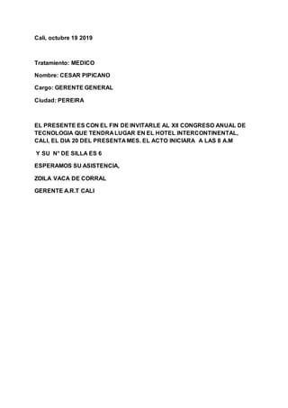 Zoila Vaca de Corral, gerente de A.R.T CALI, envió invitaciones a 16 profesionales de diferentes áreas y ciudades colombianas para asistir al XII Congreso Anual de Tecnología que se llevará a cabo el 20 de octubre en el Hotel Intercontinental de Cali a las 8am. Cada invitación incluye el nombre, cargo y número de silla de cada asistente.