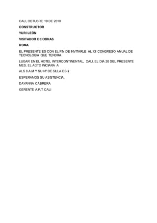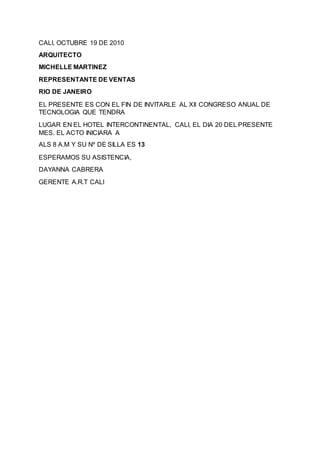 El documento contiene 20 invitaciones al XII Congreso Anual de Tecnología en el Hotel Intercontinental de Cali el 20 de octubre. Cada invitación incluye el nombre y la profesión de la persona invitada, así como el número de silla asignado.