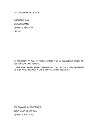 La carta invita al ingeniero Carlos Arana, gerente de Asocaña, al XII Congreso Anual de Tecnología que se llevará a cabo el 20 de octubre en el Hotel Intercontinental en Cali. El evento comenzará a las 8 a.m. y el número de silla del ingeniero Arana es el 8. La gerente Zoila Vaca de Corral espera su asistencia.