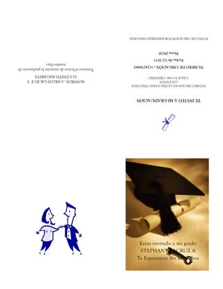 La invitación invita a alguien a la graduación de Stephany Lacruz el 6 de diciembre de 2013 a las 9:30 am. La ceremonia tendrá lugar en la finca Pasofino Vida, Los Patios, Calle 9 #9-46 en Criadero. Se proporciona un número de ubicación y los padres de Stephany, Carlos Lacruz y Lucenith Angarita, tienen el honor de anunciar la graduación de su hijo.