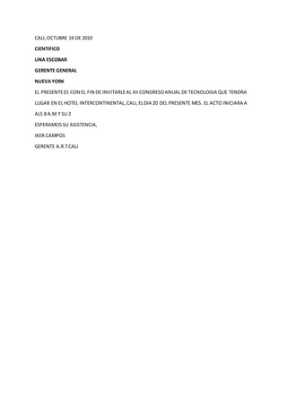 El documento contiene 20 invitaciones al XI Congreso Anual de Tecnología en el Hotel Intercontinental de Cali el 20 de octubre de 2010. Iker Campos, gerente de A.R.T Cali, invita a profesionales de diversas áreas como biólogos, médicos, ingenieros, entre otros, para que asistan al evento que dará inicio a las 8 a.m.