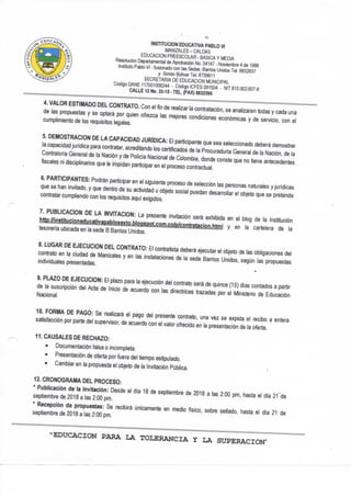 El documento es una invitación pública de la Institución Educativa Pablo VI en Manizales, Colombia, para seleccionar contratistas que realicen el mantenimiento de equipos y suministros de computación. La invitación describe los procedimientos y requisitos para la selección, que incluyen plazos, evaluación de propuestas, y especificaciones del objeto a contratar.