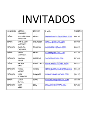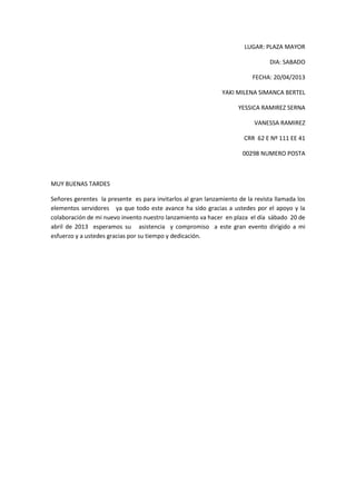 Este documento proporciona una lista de 10 invitados a un evento de lanzamiento de una revista, incluyendo sus nombres completos, empresas, direcciones de correo electrónico y números de teléfono. También incluye detalles sobre el lugar, fecha y hora del evento de lanzamiento programado para el sábado 20 de abril de 2013 en la Plaza Mayor.