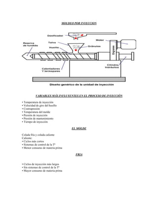El documento describe el proceso de moldeo por inyección, incluyendo las variables más influyentes como la temperatura y presión, los tipos de moldes fríos y calientes, los defectos comunes, y las etapas del proceso que incluyen el cierre del molde, la inyección, la plastificación y el enfriamiento. Explica cada etapa en detalle, como el llenado de la cavidad con material fundido a alta presión, seguido de una fase de mantenimiento para compensar la contracción, antes de que el molde se ab
