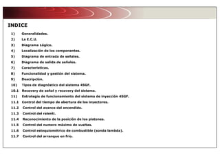 El documento describe el sistema de inyección electrónica y encendido Magneti Marelli IAW4SGF. El sistema controla la inyección secuencial y sincronizada de combustible y el encendido estático a través de una unidad de control electrónica (ECU). La ECU monitorea múltiples sensores para adaptarse a las condiciones del motor y mejorar el rendimiento y las emisiones. El sistema también incluye funciones de autodiagnóstico y autoaprendizaje.