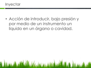 El documento describe los diferentes tipos de inyecciones, incluyendo vía intramuscular, intradérmica, subcutánea e intravenosa. Explica las partes de las jeringas y agujas, los calibres y longitudes de agujas, y las zonas del cuerpo donde se pueden aplicar cada tipo de inyección. También detalla los pasos para aplicar correctamente una inyección, como preparar el material, elegir la zona, aplicar el medicamento, y desechar los residuos de manera segura.