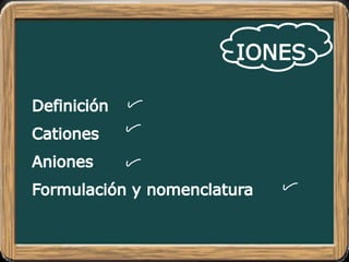 Este documento lista diferentes tipos de iones inorgánicos, incluyendo cationes como Fe3+, Cu+, Ca2+, y aniones como CO32-, S2-, Cl-. Describe la nomenclatura y formulación de iones monoatómicos y poliatómicos, así como ejemplos de cationes poliatómicos como NH4+ e iones oxo como CO32-.