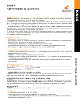 Ionex es un aditivo a base de nitrito de calcio que inhibe la corrosión del acero de refuerzo en el concreto al impedir que los iones de cloruro reaccionen con los iones ferrosos en los defectos de las capas de óxido férrico que protegen el acero, formando una barrera que evita la penetración del cloruro. Se recomienda para estructuras en ambientes marinos u otros con contenidos de cloruro y su dosificación depende de la concentración de cloruro esperada.