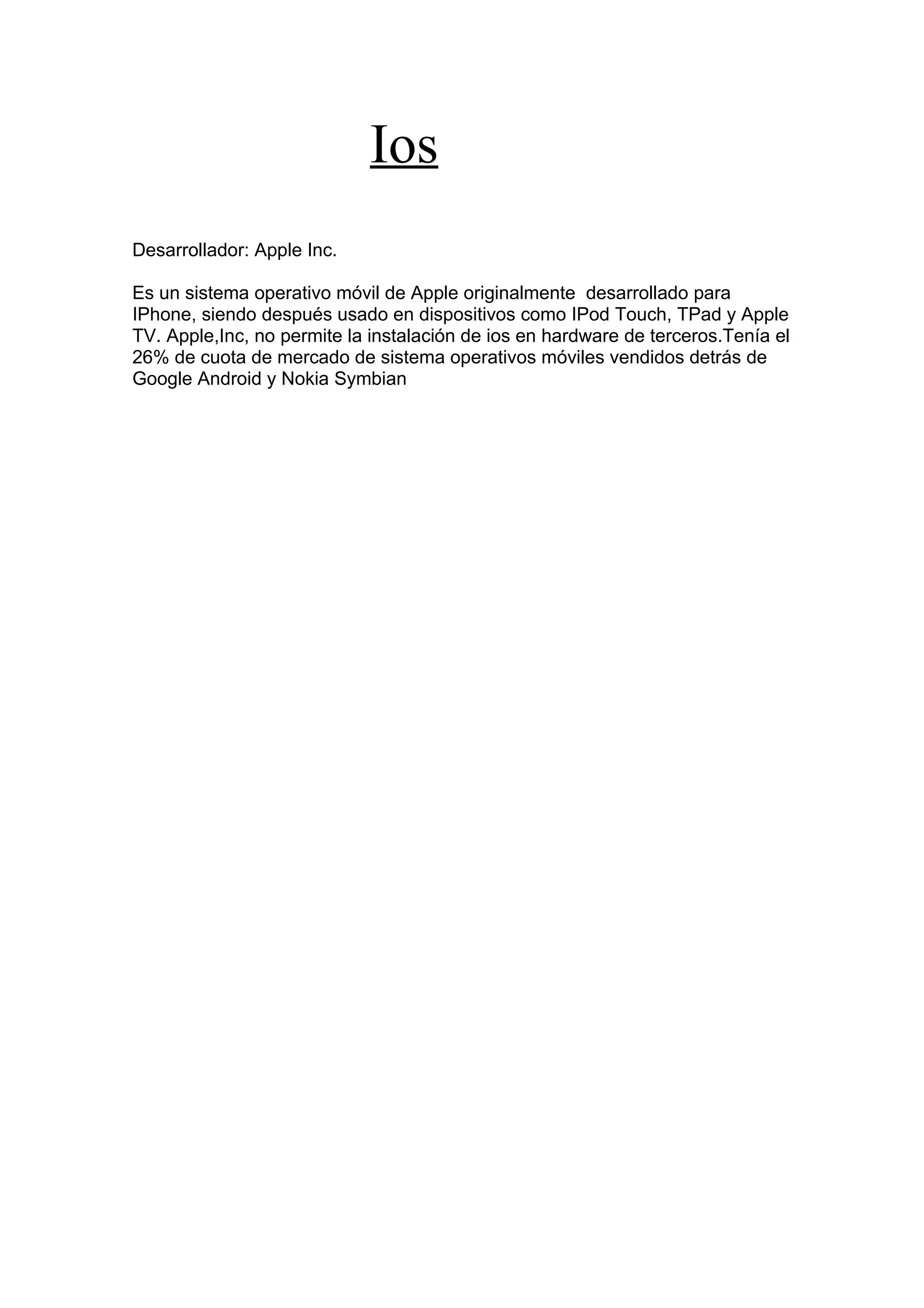 iOS es el sistema operativo móvil desarrollado por Apple para iPhone, iPad, iPod Touch y Apple TV. No permite la instalación en hardware de terceros y tiene el 26% del mercado de sistemas operativos móviles, detrás de Android y Symbian.