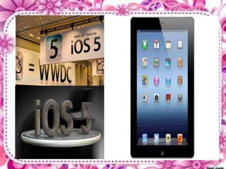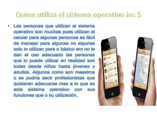El documento presenta el sistema operativo iOS 5 desarrollado por Apple. Explica que iOS es el sistema operativo para dispositivos móviles de Apple como el iPhone y el iPad. Describe algunas características clave de iOS 5 como Siri, Mapas, Música y FaceTime. También discute ventajas como la interfaz intuitiva y desventajas como la falta de personalización y soporte para Flash.