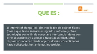 El Internet de las Cosas (IoT) conecta objetos físicos a Internet a través de sensores para compartir y recopilar datos con poca intervención humana. Las tecnologías como sensores de bajo costo, conectividad, cloud computing, machine learning y analítica hacen posible que IoT conecte objetos desde dispositivos domésticos hasta herramientas industriales. Algunas aplicaciones de IoT incluyen mejorar la eficiencia industrial, el seguimiento de activos, el análisis de salud humana y cambios de procesos empresarial