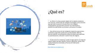 El documento describe el Internet de las Cosas (IoT), que se refiere a la interconexión digital de objetos cotidianos con Internet a través de sensores, computadores y plataformas web. Esto mejora las operaciones, seguridad y productividad al permitir obtener datos para optimizar la automatización y descubrir nuevas líneas de negocio. El documento también menciona algunos sectores privados donde el IoT se está implementando, como la industria de producción en masa, control de infraestructura urbana, control ambiental y el sector salud
