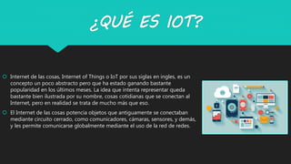 El Internet de las cosas (IoT) permite que objetos cotidianos se conecten a Internet y se comuniquen globalmente. Funciona mediante chips en objetos que les permiten funcionar como sensores u objetos activos y ser controlados de forma remota a través de una dirección IP. Los beneficios de IoT incluyen nuevos modelos de negocio, mayor eficiencia operativa, mayor productividad laboral y mejores experiencias para los clientes.