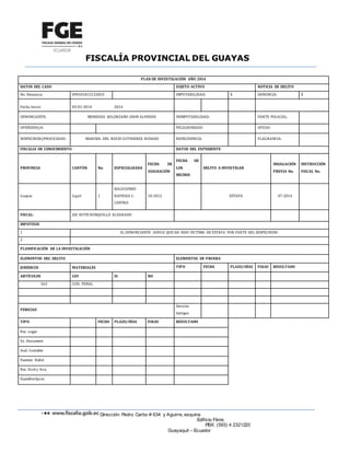 El documento describe una investigación penal en Ecuador por un presunto delito de estafa. La fiscal Ruth Ronquillo abre una indagación previa basada en la denuncia de Jhon Alfredo Mendoza Solorzano contra Marisol del Rocío Gutiérrez Rosado por estafa. La fiscal dispone que la policía judicial realice investigaciones y que el denunciante declare. También solicita información al Registro Civil sobre la identidad de la acusada.