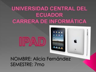El iPad es una tableta delgada con pantalla táctil a color que permite navegar por la web, ver películas, enviar correos electrónicos y leer libros electrónicos. Cuenta con un teclado en pantalla y software para hojas de cálculo y procesamiento de textos. Sirve para leer el correo y navegar por la web desde la terraza o el sofá.
