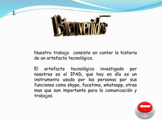 El documento resume la historia del iPad. Explica que el iPad es un dispositivo entre un teléfono inteligente y una computadora portátil que se enfoca más en el acceso a aplicaciones que en su creación. Incluye una línea de tiempo que indica que el iPad original fue anunciado en 2010, mientras que la segunda generación fue presentada por Steve Jobs en 2011 y una tercera generación fue lanzada en 2012.