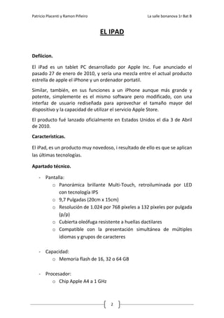 El documento describe el iPad de Apple. El iPad es una tableta con una pantalla de 9.7 pulgadas, procesador A4 de 1 GHz, y opciones de almacenamiento de 16, 32 o 64 GB. Tiene aplicaciones como iPod, iPhone y iWork. El documento discute las ventajas como su diseño delgado, pantalla de alta definición y batería de larga duración, así como las desventajas como su falta de teclado físico y webcam.