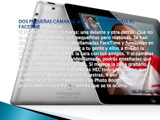 El documento describe las características y mejoras del iPad 2 en comparación con el primer iPad. El iPad 2 tiene un procesador dual-core más potente que permite la multitarea fluida y la carga rápida de aplicaciones. Ofrece gráficos hasta 9 veces más rápidos y una batería que dura 10 horas. Usa iCloud para sincronizar contenido como música, fotos y calendario entre dispositivos de forma inalámbrica.