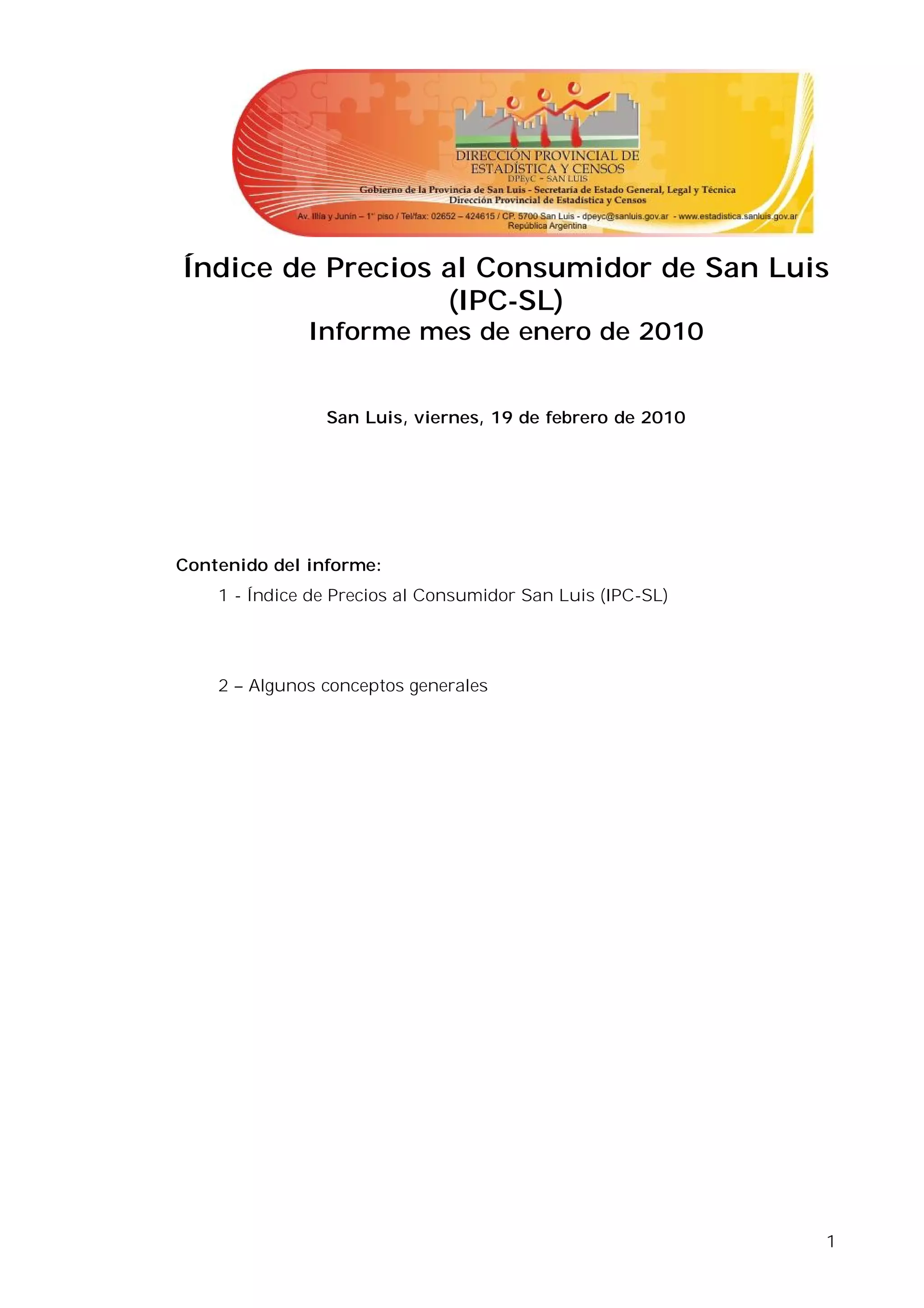 El documento resume el informe del Índice de Precios al Consumidor de San Luis (IPC-SL) para enero de 2010. El IPC-SL aumentó 2.2% respecto a diciembre de 2009, impulsado principalmente por aumentos en Alimentos y Bebidas (4.2%) y Esparcimiento (4.1%). Vivienda y Servicios Básicos también aumentó (2.4%), mientras que Indumentaria disminuyó ligeramente (1.4%). El aumento interanual fue de 19.7%.