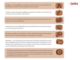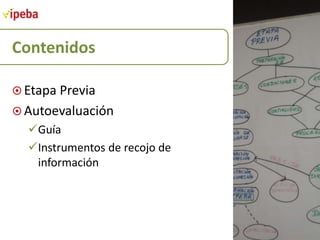 Este documento presenta las etapas del proceso de autoevaluación con fines de acreditación educativa. Explica que la autoevaluación implica una reflexión sobre la gestión de la institución educativa para lograr la formación integral de los estudiantes. Además, detalla cuatro etapas del proceso: 1) preparación, 2) identificación de fortalezas y áreas de mejora, 3) planificación de la mejora, y 4) socialización del informe de autoevaluación. Finalmente, proporciona una guía e instrumentos para realizar de man