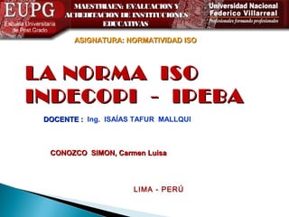 Este documento proporciona información sobre la norma ISO y el Instituto Nacional de Defensa de la Competencia y de la Protección de la Propiedad Intelectual (INDECOPI) en Perú. Explica que INDECOPI es responsable de promover la calidad, la competencia y la protección de la propiedad intelectual en Perú de acuerdo con las normas ISO. También describe algunos de los servicios que ofrece INDECOPI, como la acreditación de laboratorios y organismos de certificación.