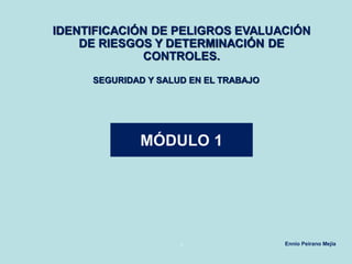 Este documento presenta información sobre la identificación de peligros, evaluación de riesgos y determinación de controles en seguridad y salud ocupacional. Explica los pilares de la seguridad y salud en el trabajo, el proceso de identificación de peligros, clasificación de peligros, evaluación de riesgos, y define conceptos como riesgo y enfermedad. El objetivo es brindar herramientas para prevenir lesiones y enfermedades ocupacionales.